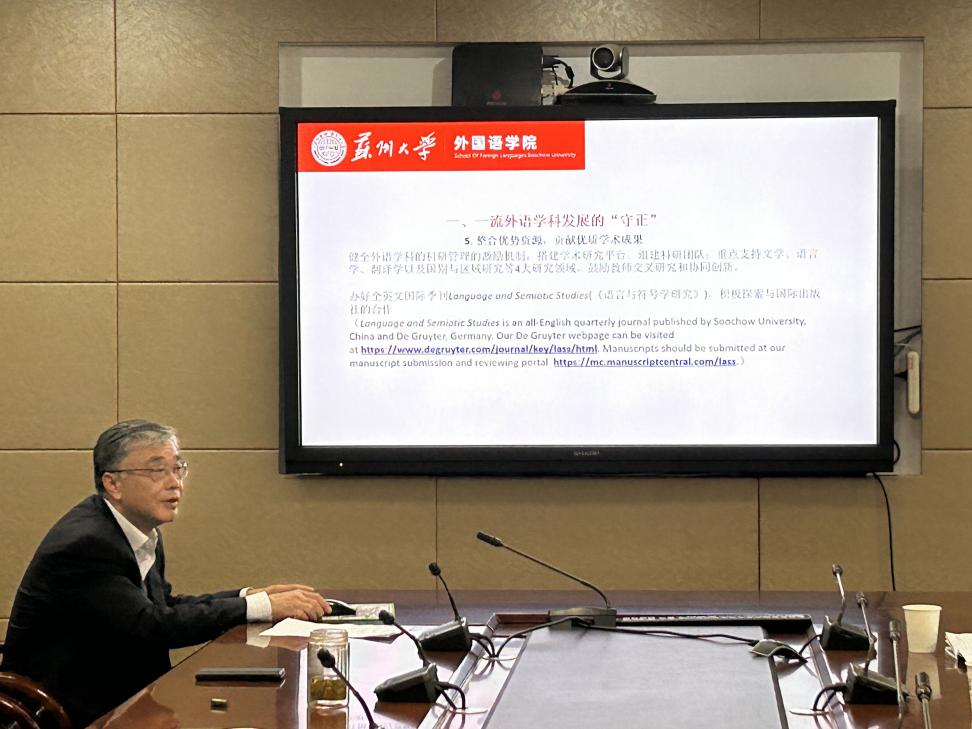 随后,朱新福院长介绍了探花精选 的发展现状,朱院长指出,要“提高外国语言文学学科的综合竞争力,培育和发展新文科和交叉学科”,并注重教师发展,加大师资队伍建设,以及高层次人才培养和引进的支持力度,形成良好的学科梯队。同时,通过打造翻译学科高原、建立专业实践基地,以及提升服务社会水平等举措,提升外语学科发展水平。