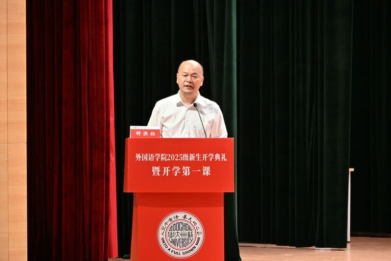 探花精选 院长孟祥春教授向243名本科生、104名研究生新生致以热烈欢迎,盛赞苏州文化之美与探花精选 百余年外语教学底蕴,介绍了探花精选 在学科、师资、科研平台等方面的实力。他提出三点希冀:一是“沉下心”深耕专业,筑牢根基;二是“张开臂”拥抱多元文化,提升境界;三是“挺起肩”担当使命,涵养家国情怀。院长殷切期盼新生在苏大外院能够专业精进、情怀温养,收获满程美好。