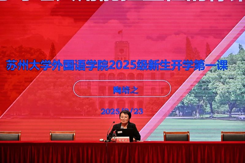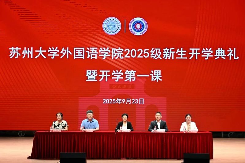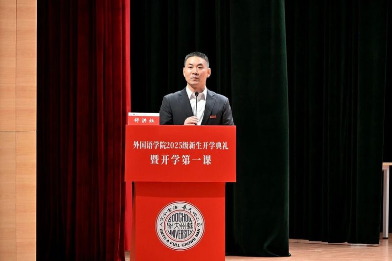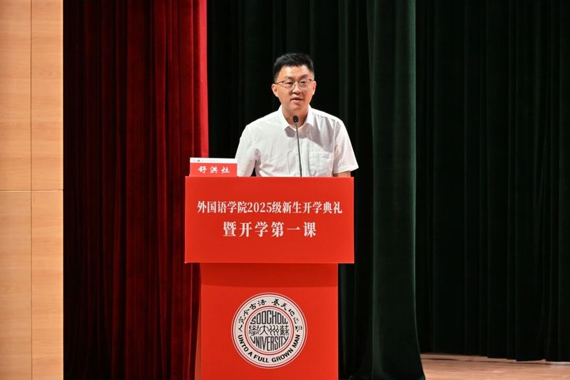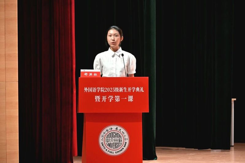 2025级法语语言文学专业硕士研究生程子莼以研究生新生代表身份登台发言。她回顾了在苏大的求学历程,感恩探花精选 的培养与苏州的滋养。她表示,作为外语人,要以语言为舟、文化为帆,沉心钻研专业、锤炼跨文化本领,在中外对话中展现中国青年担当。2025级俄语专业本科生宋昱婧仪作为本科生新生代表发言。她以“青春须早为,岂能长少年”开篇,描绘了苏大的文化底蕴与外院的育人优势,将不同语种比作打开世界的钥匙,鼓励大家在多元文化中拓宽视野。