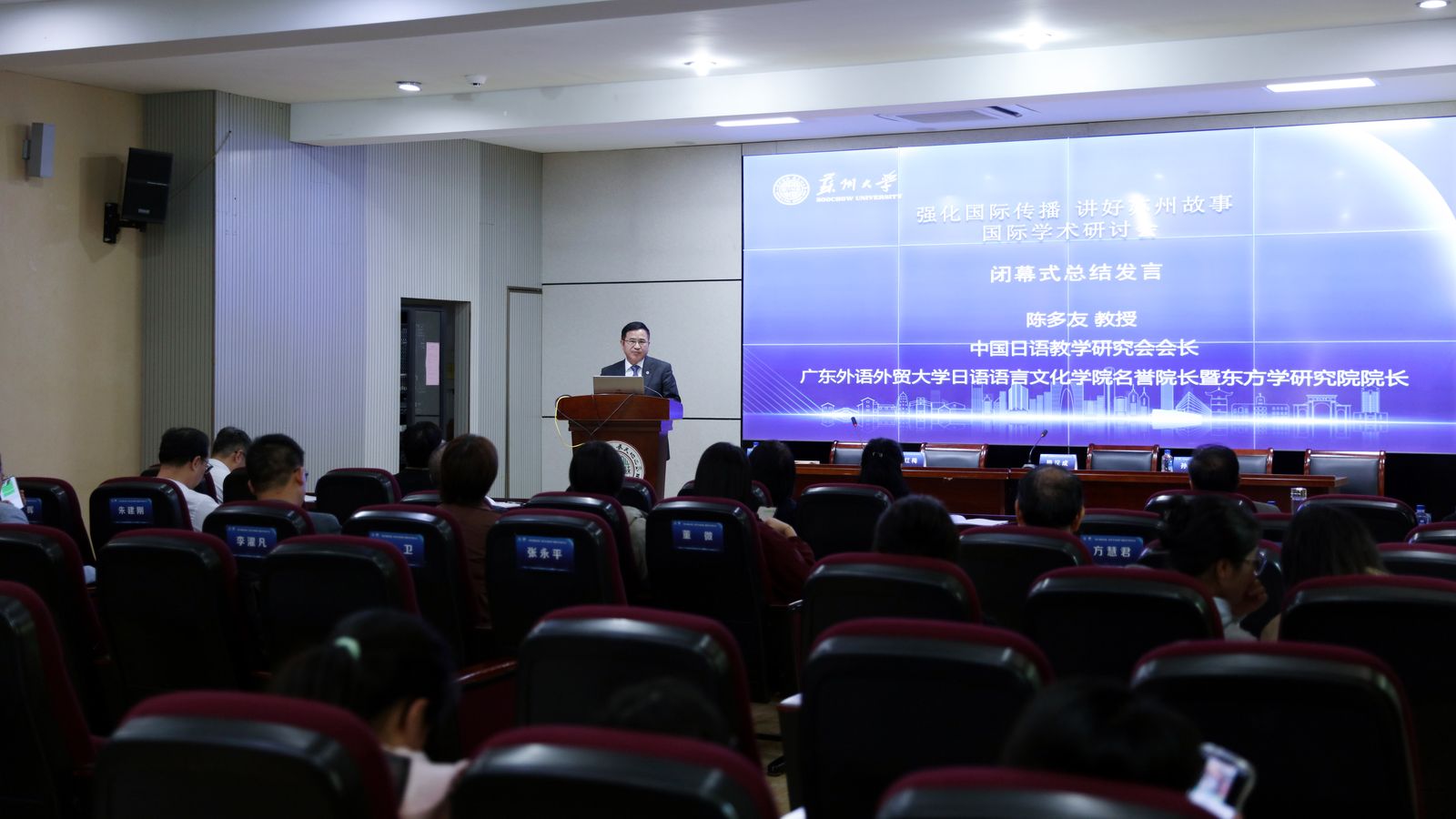 本次国际研讨会的所有学术活动到此全部圆满结束,在热烈的掌声中探花精选 施晖教授主持闭幕式,由中国日语教学研究会会长、广东外语外贸大学陈多友教授进行大会总结,对论坛的前瞻性、多学科性、高学术性等各方面给予了最高的评价,宣布“强化国际传播,讲好苏州故事”国际研讨会圆满落幕。