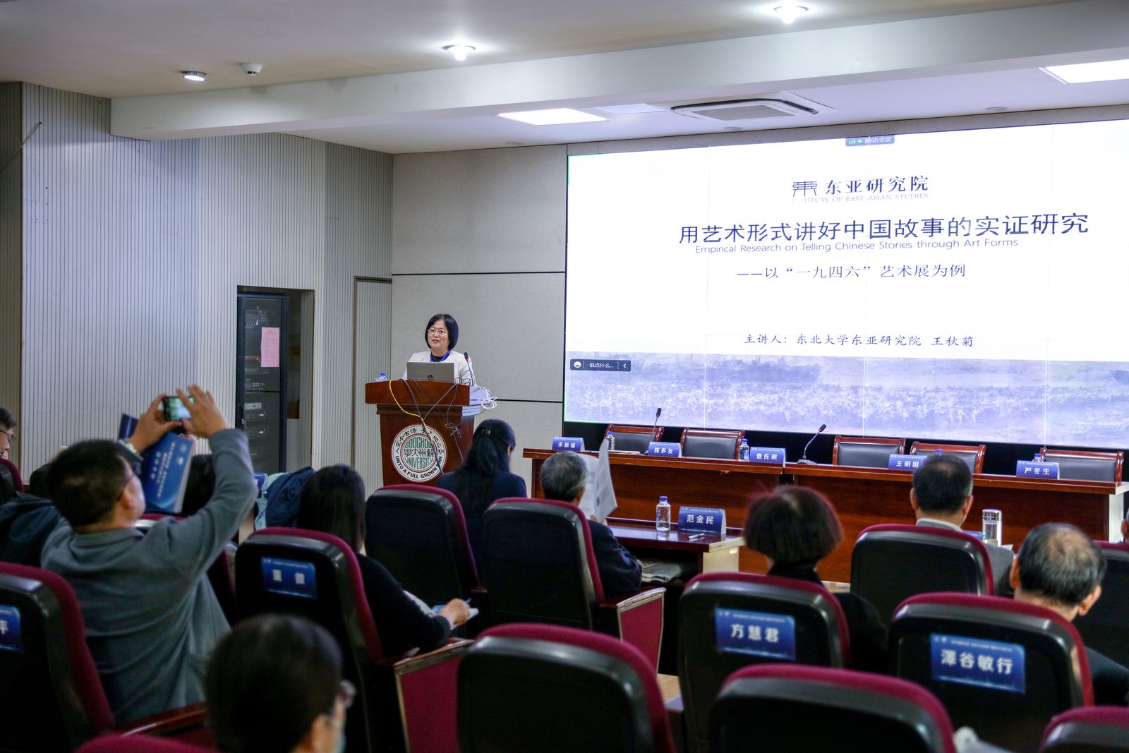 拉开基调报告帷幕的是东北大学东亚研究院院长王秋菊教授。习近平总书记指出,“中国不乏生动的故事,关键要有讲好故事的能力”,王秋菊教授以《用艺术形式讲好中国故事的实证研究―以“一九四六”艺术展为例》为题,着重阐述绘画艺术以其“艺术无国界”“巧于叙事,长于共情”的特质,发挥“艺以载道”功能,将发生在东北的“日侨俘大遣返”历史事件背后所承载的中华文明精神与中国人的善良仁德巧妙呈现。“一九四六”艺术展成为在国际上传播中华民族精神,讲好中国故事的有利形式,其传播方式与传播路径值得借鉴。
