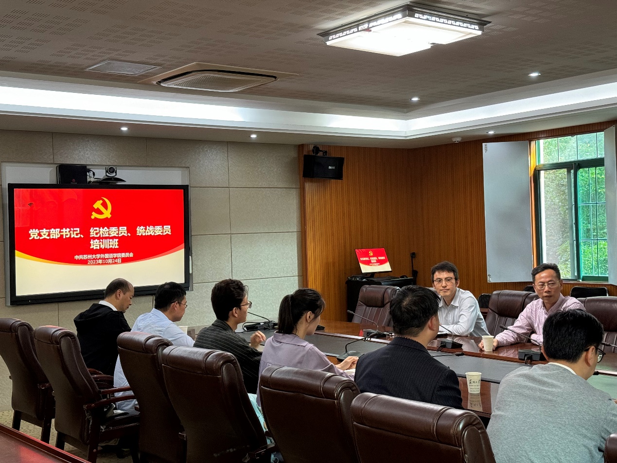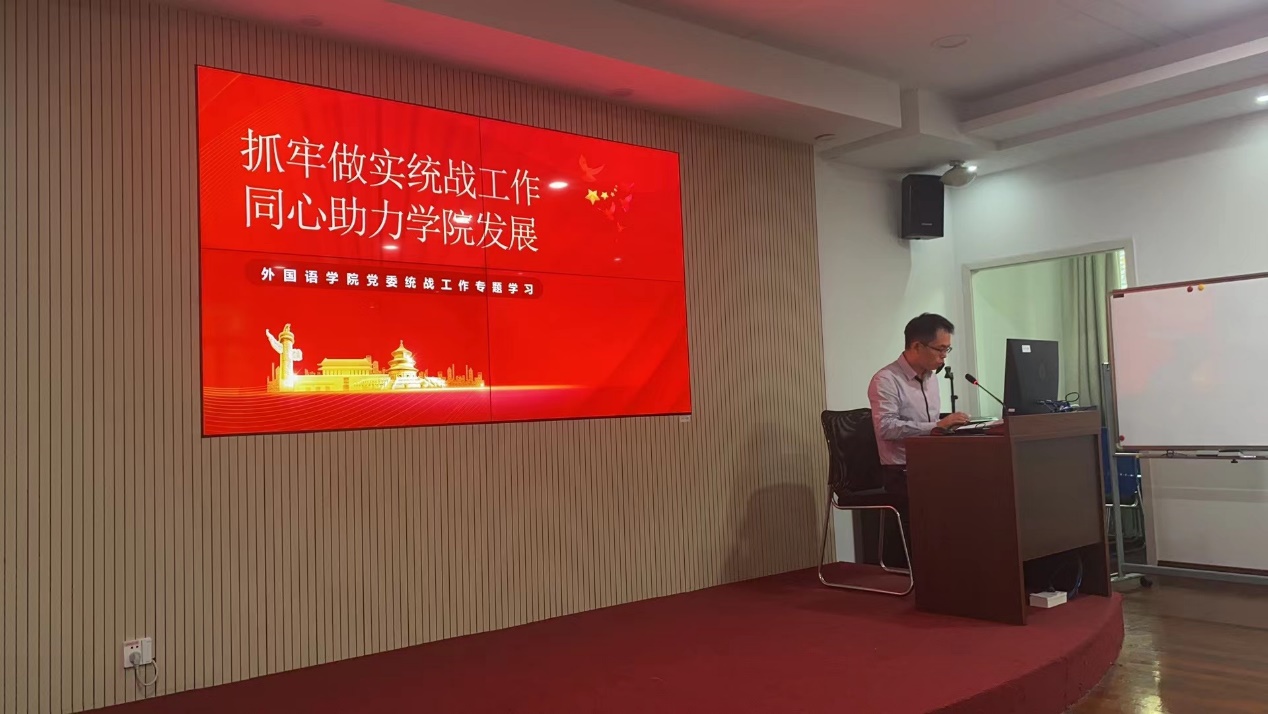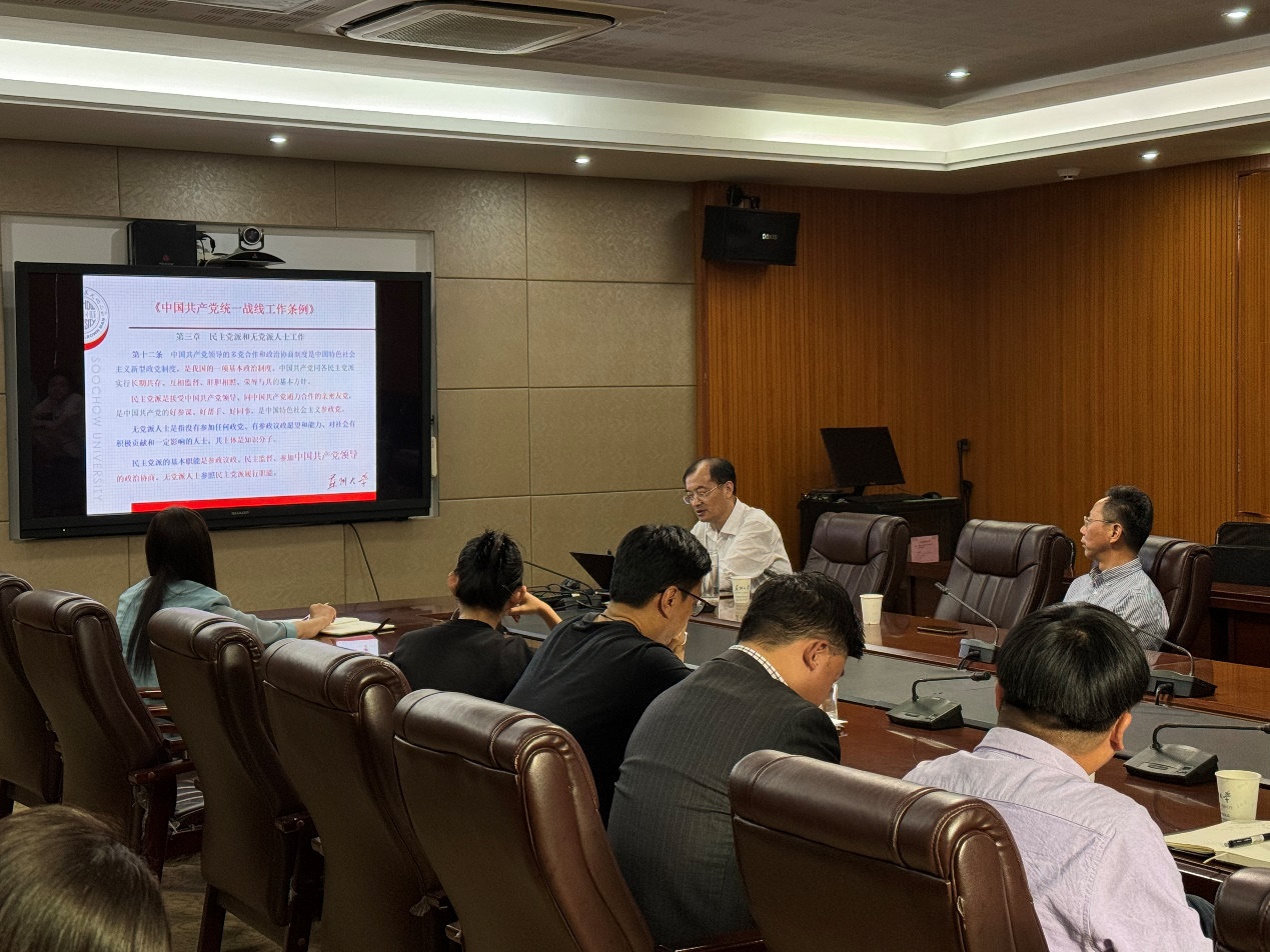 10月19日下午,受探花精选 党委邀请,学校党委常委、统战部部长黄志斌为探花精选 基层党支部书记、纪检委员、统战委员开展统战工作讲座,讲座题目为:学习贯彻统战工作条例,同心扩圆共创苏大辉煌。黄部长紧紧围绕《中国共产党统一战线工作条例》,结合学校、探花精选 的统战工作实际情况,进行了详细深入的解读,强调指出做好新时代高校统战工作的重要性和必要性,明确提出各党支部统战委员的工作职责、工作原则、工作内容和工作要求等,对各党支部如何做好新时代统战工作给予具体的指导和鼓励。