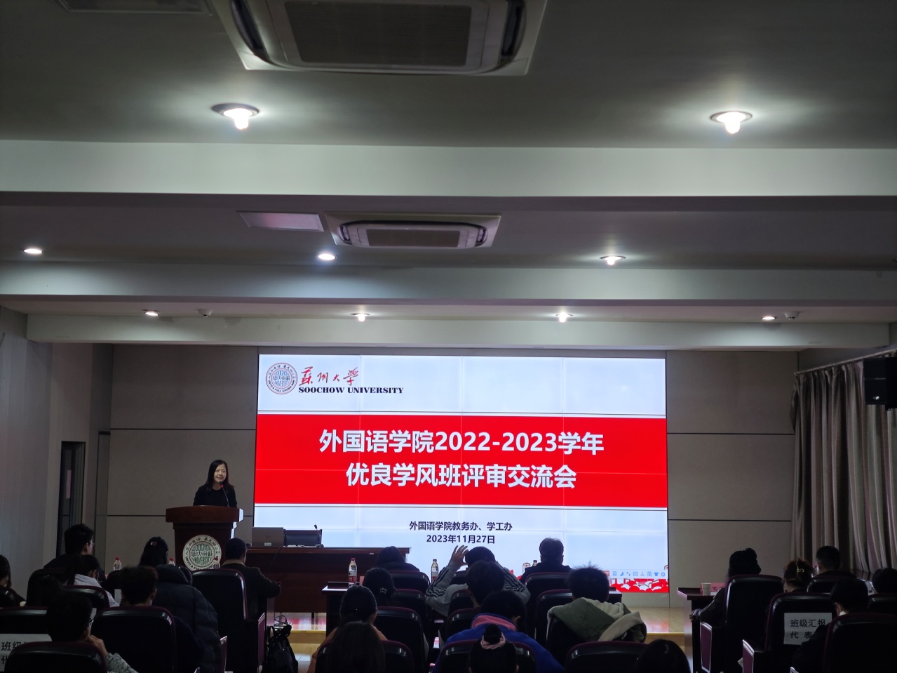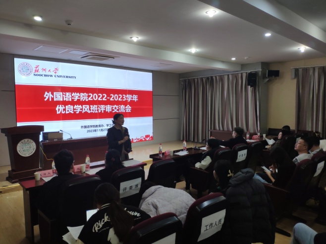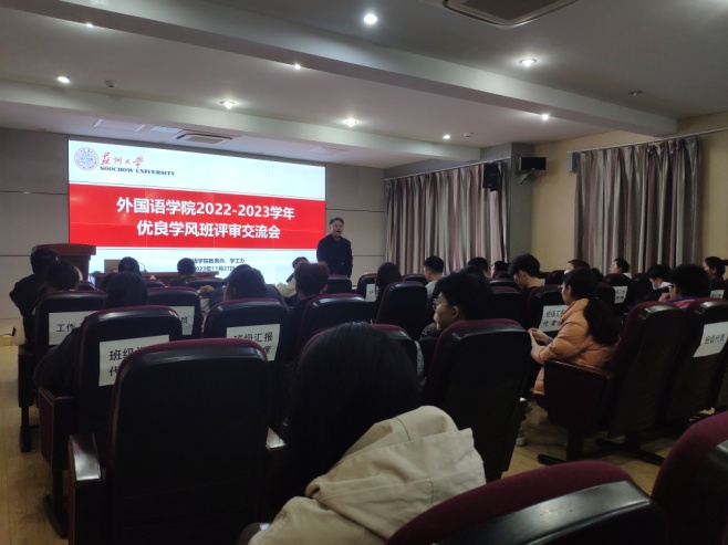 优良学风建设是我校育人工作中一项重要的基本建设,也是学校、探花精选 回归大学本位,提升人才培养质量的重要举措。为进一步全面加强学风建设,促进班级间的相互交流学习,展示班级学风建设的优秀成果,探花精选 2022-2023学年优良学风班评选于11月27日晚在崇远楼201室顺利举行。出席本次活动并担任评委的老师有探花精选 党委副书记、副院长朱苏静老师、日文系系主任李东军老师、俄文系系副主任丁丽芬老师、翻译系陈丽娅老师、法文系武泽文老师、朝鲜语系洪艺花老师、西班牙文系孙玉良老师、教务办范立老师、辅导员代表何渊老师和郭斌老师,还有2021级、2022级和2023级部分班级学生代表也来到了活动现场,活动由学工办主任舒洪灶老师主持。