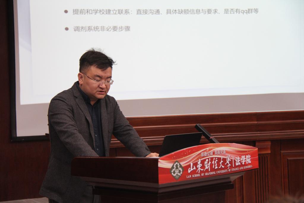 黄军杰介绍,考研调剂主要面向达到分数线但没能被安排复试或复试后没能被录取的同学,并建议同学们积极考虑报考已经进入复试的学校的调剂,最大化利用自己的考试成绩。同时他强调同学们在选择调剂学校时,要主动出击,从学校官网、学校电话和调剂意向采集服务系统等多个渠道获取信息,并结合自身的条件选择院校。随后,黄军杰向同学们介绍了近几年来法学专业考研和调剂情况,在当前考研形势严峻的背景下,他表示,同学们要根据成绩做出判断,在有限的时间内,通过校内校外信息渠道收集更多调剂信息,不要盲目二战,珍惜每一个升学机会。