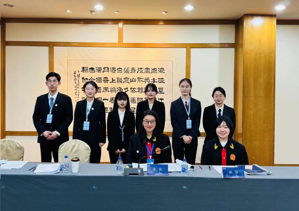 张郦老师、肖夏老师及2020级涉外班刘家欣担任赛队教练;由2021级涉外班葛子琪,2022级涉外班张文馨、张亚雯,2022级三班李承霖,2022级五班尹萌分别担任庭辩员与研究员。自2023年10月队员们开始研究赛题、撰写书状,经过半年的精心打磨,顺利入围正赛。之后半个月队员们为备赛庭辩轮,开展了高频次的模拟。