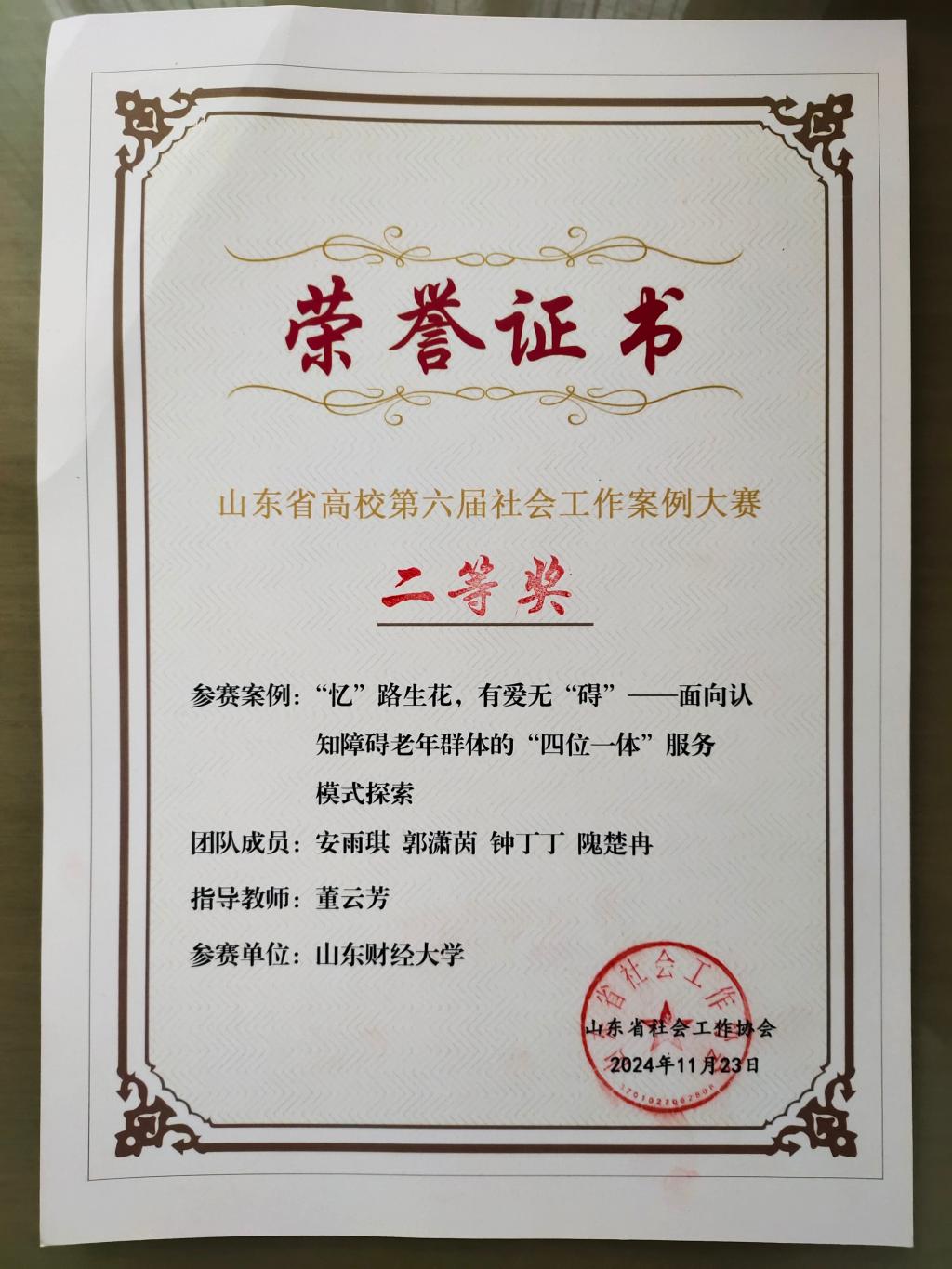 24级社会工作专业研究生团队(指导教师:董云芳;负责人:安雨琪;团队成员:郭潇茵、钟丁丁、隗楚冉)申报的案例项目在激烈的竞争中脱颖而出,荣获山东省二等奖。
