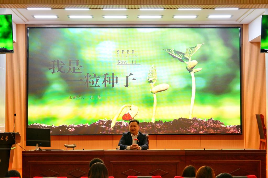 王勇首先对讲座的主题“我是一粒种子”进行了简单阐述。他表示每个人都是一粒种子,在成长的过程中要不断地汲取力量,种子的力量就是自强不息,不达目的不罢休,拥有不屈不挠的力量。“一万年太久,只争朝夕”,当代青年应该像种子一样努力地生根发芽、向上生长。王勇通过分享自己的成长经历及与困难作斗争的励志人生,告诉同学们应该有种子一般的力量,坚守梦想、不吝付出。身体状况和家庭境遇是不能选择的,但对于人生的态度是可以选择的,他希望同学们要学会感恩。