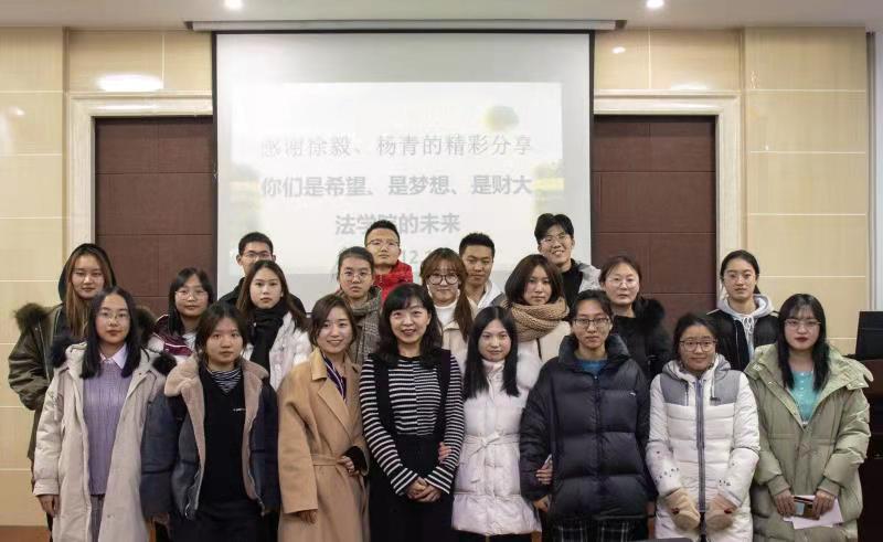 活动伊始,主持人首先介绍了优秀校友并对他们的到来表示欢迎。随后,徐毅谈自己在本科生和在对外经贸大学研究生的学习经历和所在律所的工作经历及现状,杨青通过“奇妙的因果联系”小故事分享关于她在香港中文大学学习和工作的想法,向我们传达了“你今天所做的一切,将会在很大程度上改变你的余生,影响你以何种方式在未来生活”的理念。接着,在活动互动环节,两位优秀校友针对在校生在近期学习及未来规划中遇到的困惑逐一进行解答。学长学姐细致且专业的回答获得在场学生的钦佩与肯定。之后,学长学姐给我们在校生四点建议:学好课程、学好英语、勇敢尝试、多陪家人。