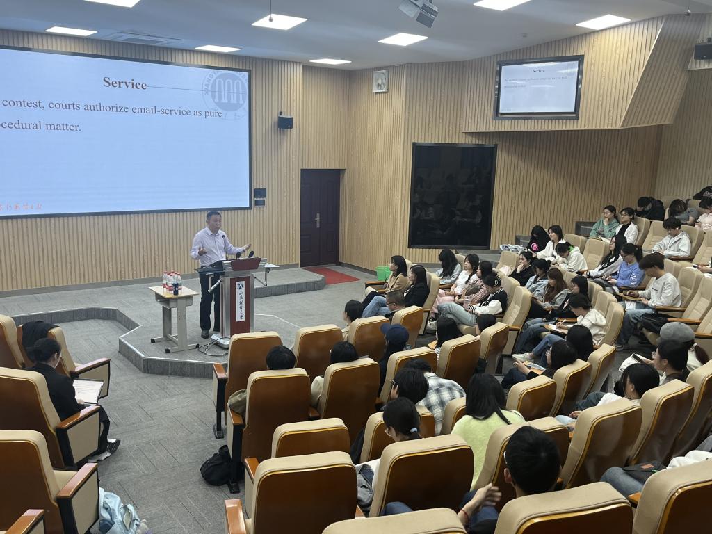 在讲座期间,覃斌武教授以幽默风趣的讲话风格和生动形象的类比举例,向在座师生剖析了中、美两国民事诉讼程序法的不同,以近年来美国法院对于我国跨境电商行使域外管辖权的案例为主旨,以其自身经办的案件为切入口,分析了此类案件数量激增的原因、讲解了法律争议焦点、提出了破解方案。覃斌武勉励在座同学,要常怀爱国之心,将法律人的职业追求同家国大义相结合,开阔眼界看世界。之后,覃斌武还为在场的同学剖析了刚刚举办的第十二届国际刑事法院模拟法庭比赛赛题,并为探花精选
