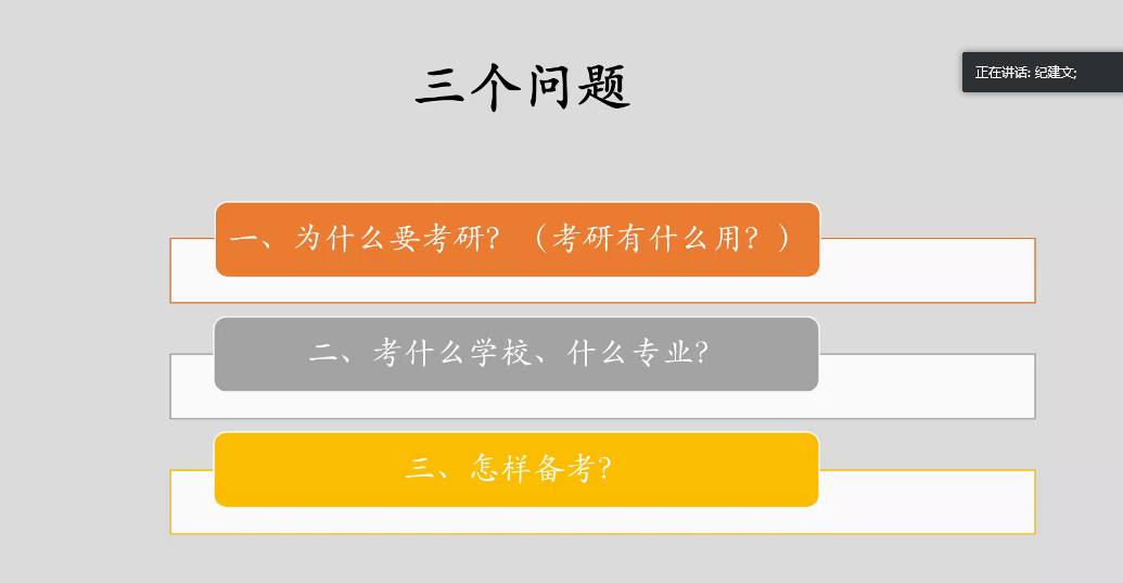 纪建文围绕为什么考研、考什么学校专业和怎样备考这三个问题,具体详细地为同学们分析了考研过程中可能遇到的问题,针对不同报考学校给出指导性建议。为了便于同学们理解,纪建文借助实例,强调同学们要及时把握信息,抓住机会。最后,危红和纪建文为参与交流的同学解答同学们关心的热点问题,并送上真挚的祝福。